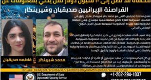 أعلن برنامج “مكافآت من أجل العدالة” التابع لوزارة الخارجية الأميركية، عن مكافأة تصل قيمتها إلى 10 ملايين دولار مقابل معلومات عن شخصين إيرانيين هما فاطمة صديقيان كاشي ومحمد باقر شيرينكار. وقال البرنامج في بيان: “يقدّم برنامج ’المكافآت من أجل العدالة‘ مكافأة قد تصل إلى 10 ملايين دولار لمن يُدلي بمعلومات …