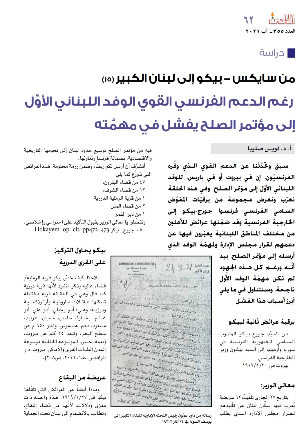 الحلقة 15 من دراسة د. لويس صليبا “من سايكس بيكو إلى لبنان الكبير” تدرس أسباب فشل الوفد اللبناني الأول إلى مؤتمر الصلح في مهمّته ما أدّى بالنهاية إلى تشكيل وفد.ثانٍ برئاسة البطريرك الحويّك. وتعرض مجموعة من الوثائق العائدة إلى تلك الحقبة تنشر للمرّة الأولى بالعربية.