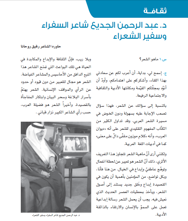 الشاعر رفيق روحانا يحاور السفير الدكتور عبد الرحمن الجديع شاركها Facebook Twitter Stumbleupon LinkedIn Pinterest